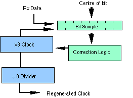 The adjustment is performed by correction logic based on a high-speed sample of each bit (at eight times the bit rate in the figure below). To illustrate this, if the sampled signal shows a single transition at the centre of the bit, the clock is already aligned. If the transition appears to the right of centre, the clock period is too long, and the frequency is increased. If the transition appears to the left, the period must be too short, so the frequency is decreased. Not all waveforms generate a transition for each bit, if there are no transitions the circuit does not perform correction. This is decribed more in the following section.