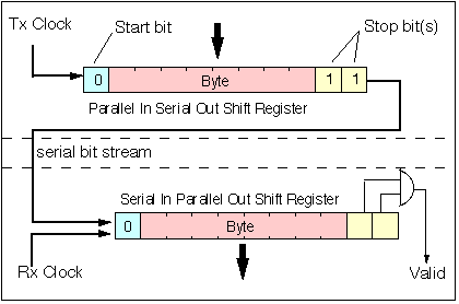 At the receiver, a clock of the same nominal frequency is constructed and used to clock-in the data to the receive shift register. Only data that are bounded by the correct start and stop bits are accepted. This operation is normally performed using a UART - Universal Asynchronous Receiver Transmitter. The receiver is started by detecting the edge of the first start bit as shown below: