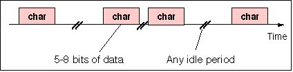 An asynchronous link communicates data as a series of characters of fixed size and format. Each character is preceded by a start bit and followed by 1-2 stop bits. Parity is often added to provide some limited protection against errors occurring on the link. The use of independent transmit and receive clocks constrains transmission to relatively short characters (<8 bits) and moderate data rates (< 64 kbps, but typically lower). The asynchronous transmitter delimits each character by a start sequence and a stop sequence. The start bit (0), data (usually 8 bits plus parity) and stop bit(s) (1) are transmitted using a shift register clocked at the nominal data rate.