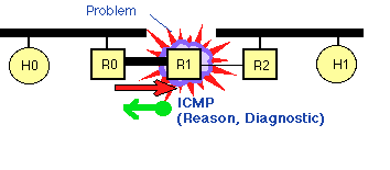 ICMP messages generated by router R1, in response to message sent by H0 to H1 and forwarded by R0. This message could, for instance be generated if the MTU of the link between R0 and R1 was smaller than size of the IP packet, and the packet had the Don't Fragment (DF) bit set in the IP packet header. The ICMP message is returned to H0, since this is the source address specified in the IP packet that suffered the problem.