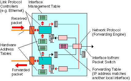 Once the appropriate output interface has been identified, the forwarding engine then requests the packet switch to form a connection to the appropriate output interface. The packet is then moved through the router to the output network interface controller. Although large routers actually implement a switch as a hardware component, most smaller routers do not actually contain a "real" switch. In other routers, the switch takes the form of a shared memory data structure in which all received packets are stored. The switching operation therefore consists of removing a pointer from the receive queue, and copying the value of the pointer to the appropriate transmit queue. In some cases, the entire packet data is copied from one bank of receive memory to another transmit memory using a computer bus.