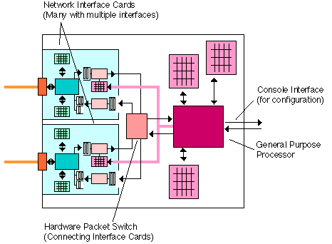 Block diagram of a complete router showing the interfaces Interfaces to the network (over which packets are received or transmitted) are shown left, and the control interface (used to set up and reconfigure the router) is shown right.