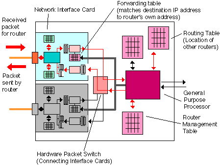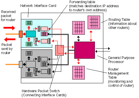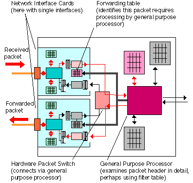 In the simplest case, the processing of packets is implemented in the general purpose processor which implements all the algorithms. More advanced routers may separate "forwarding" (the tasks of moving packets from one interface to another) from "routing" (the task of determining the best path through the network) and include a number of processors capable of performing these tasks. A router interface card resembles the LAN Network Interface Cards (NICs) used in PCs except that the card is normally of a higher specification (faster packet processing). The very first routers were designed used standard network interface cards, but modern high performance routers use special high performance interface cards and may also include a "Forwarding Engine" on-board the card which speeds the operation.