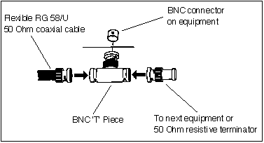 The connection to a network interface card supporting 10B2 cabling is usually via a BNC connector, as shown in the figure. Sometimes, as in this figure, an AUI port is also provided as an alternative to connect other media (e.g. 10B5, or 10BF). Networks are built by connecting a âTâ joiner(1), to the NIC and a length of BNC cable to each side of the joiner (2). This forms a cable segment. A 50 Ohm BNC terminator is added to the last NICs at each of the cable (3).