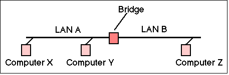 Frames with a source address of X and destination address of Y are received and discarded, since in this case the computer Y is directly connected to the LAN A, whereas frames sent from X with a destination of Z are forwarded to network B by the bridge.