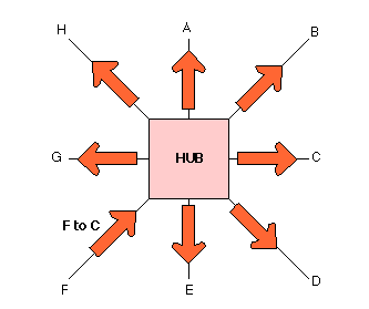 A hub (or repeater) forwards a received frame to all the output interfaces (ports), resulting in the frame reaching all connected equipment in the collision domain, even though a unicast frame will be only destined for a system connected to one of the interfaces (C, in the above diagram).