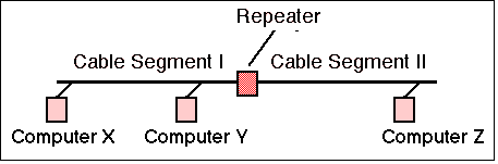 The DPLL in the transceiver can not always lock on to the start of a frame's preamble. Usually this takes a number of bit periods for a receiver to completely synchonise with the Manchester Encoded data. An important job of a repeater is therefore to reconstruct this preamble before it sends the signal to the next cable segment. For example, consider a frame sent by X (above). This frame will be received by the computer Y and the repeater. In each case, the first part of the preamble will be lost, since the transceiver will not have acquired lock on to the Manchester Encoded clock signal. If the shortened preamble were to be sent on to computer Z, it could be insufficient to allow Z to acquire a lock before the start of the frame. A repeater must therefore reconstruct the full preamble before a frame is sent out of the repeater.