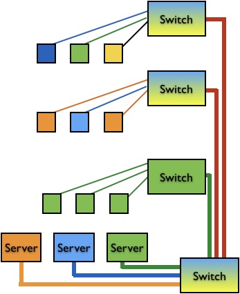 The figure above shows a VLAN deployment scenario. In this example, the three servers (coloured orange, green and blue) are still within a data centre, connected by a high-speed enterprise switch.
