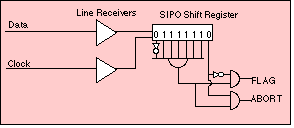 Normally a HDLC receiver starts in the idle state, waiting for the start of a frame. This is called "Hunt" mode, since the receiver is said to be hunting for a non-flag sequence. This may be achieved through a shift register and combinational logic as shown (a Finite State Machine (FSM) is usually used to implement this):