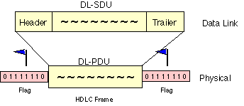 HDLC Frame Structure showing flags, header (address and control), data and trailer (CRC-16).