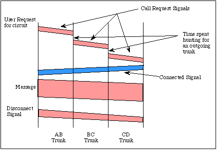 Node B receives the connection request and identifies a path to the destination (D) via an intermediate node (C). This is followed by a circuit connection phase handled by the switching nodes and initiated by allocating a free circuit to C (link BC), followed by transmission of a call request signal from node B to node C. In turn, node C allocates a link (CD) and the request is then passed to node D after a similar delay.