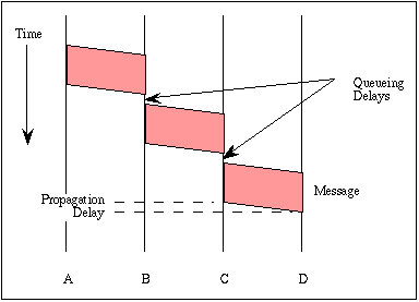 The figure illustrates message switching; transmission of only one message is illustrated for simplicity. As the figure indicates, a complete message is sent from node A to node B when the link interconnecting them becomes available. Since the message may be competing with other messages for access to facilities, a queuing delay may be incurred while waiting for the link to become available. The message is stored at B until the next link becomes available, with another queuing delay before it can be forwarded. It repeats this process until it reaches its destination.