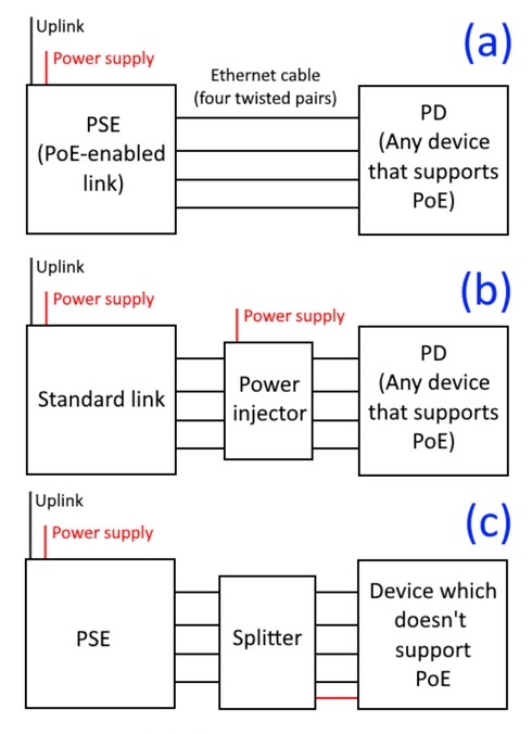 Block diagram of power over ethernet equipment showing the PSE and PD, showing (a) endspan delivery; (b) midspan with PoE Injector; (c) midspan with PoE Splitter