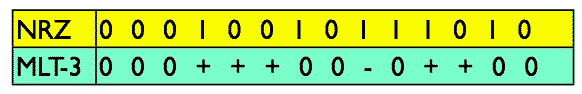 As in AMI, a 0 bit is encoded as no change of level.The line encoding using 3-level MLT encoding should be shown. The student should note the three levels used (+, -, 0) to reduce the required bandwidth to 31.25 MHz, suitable for transmission over the installed based of twisted pair cables.